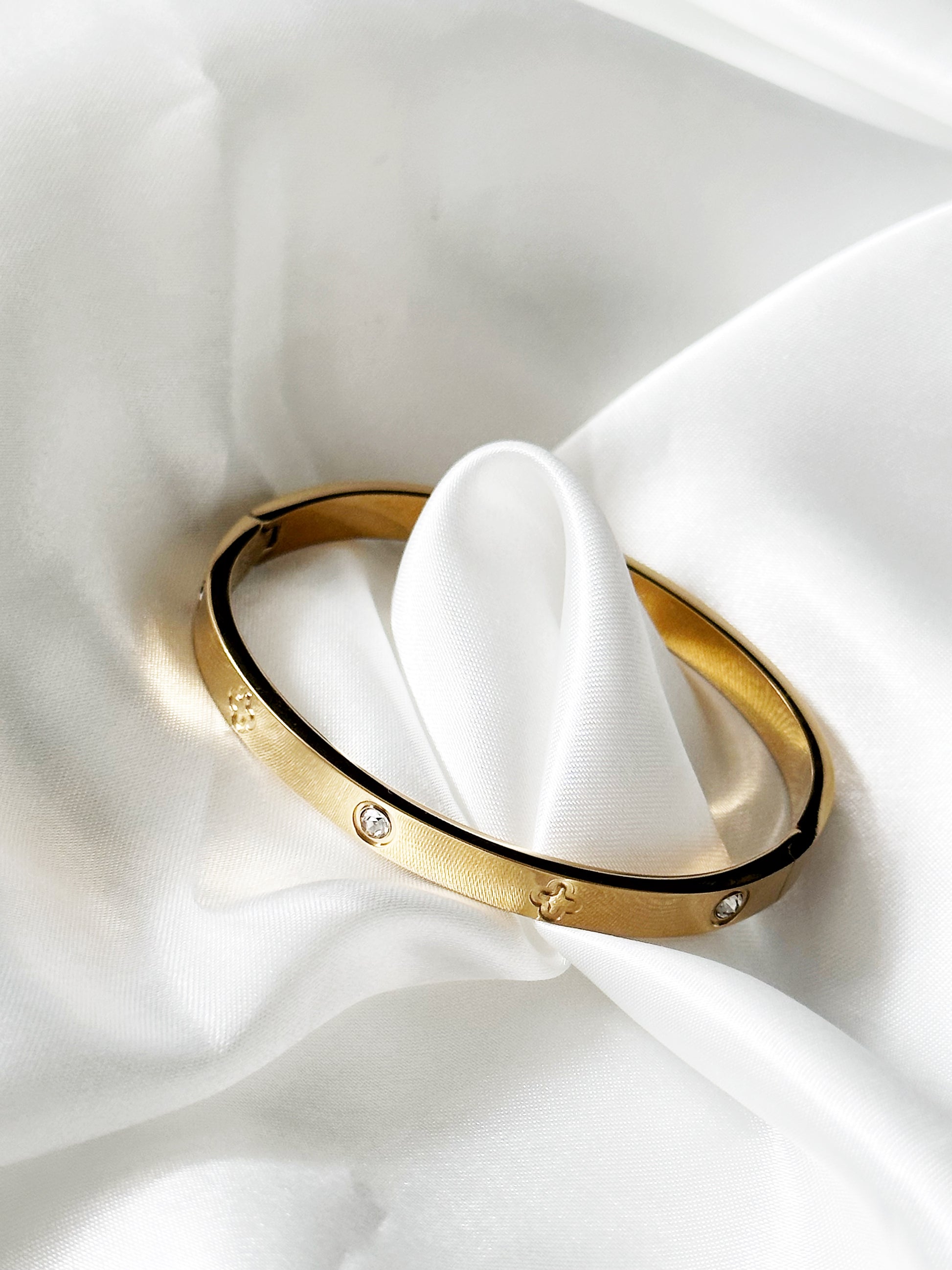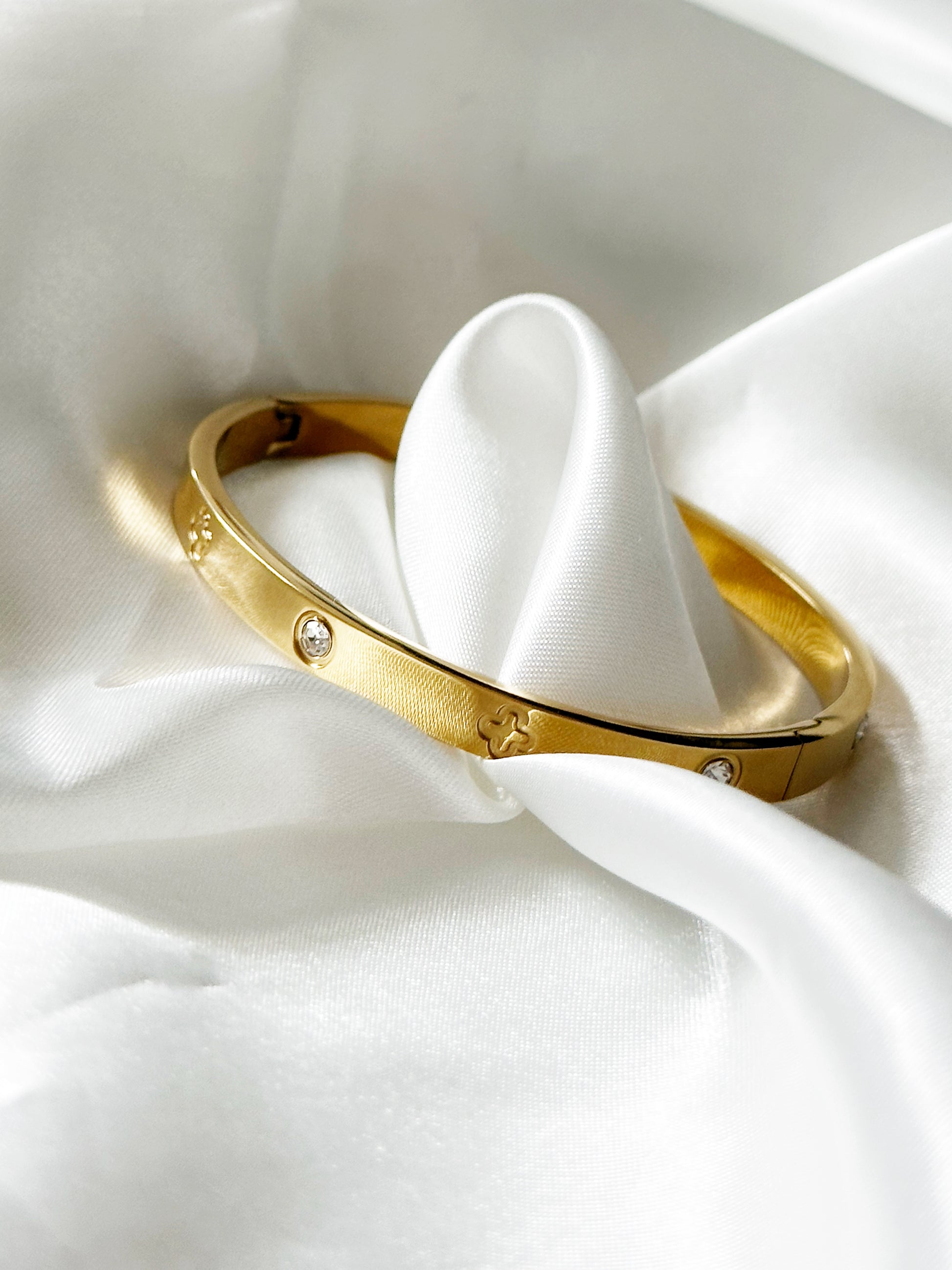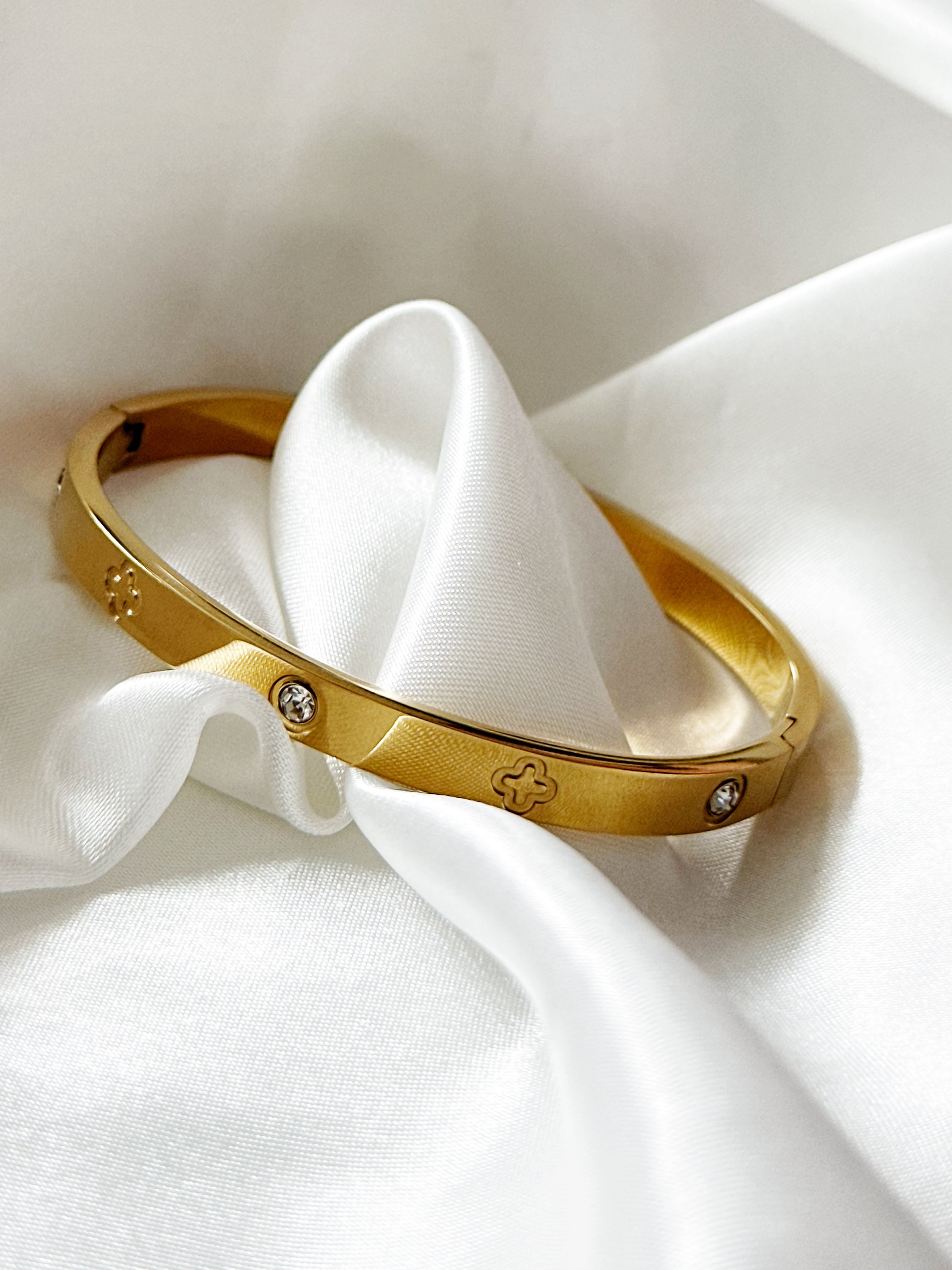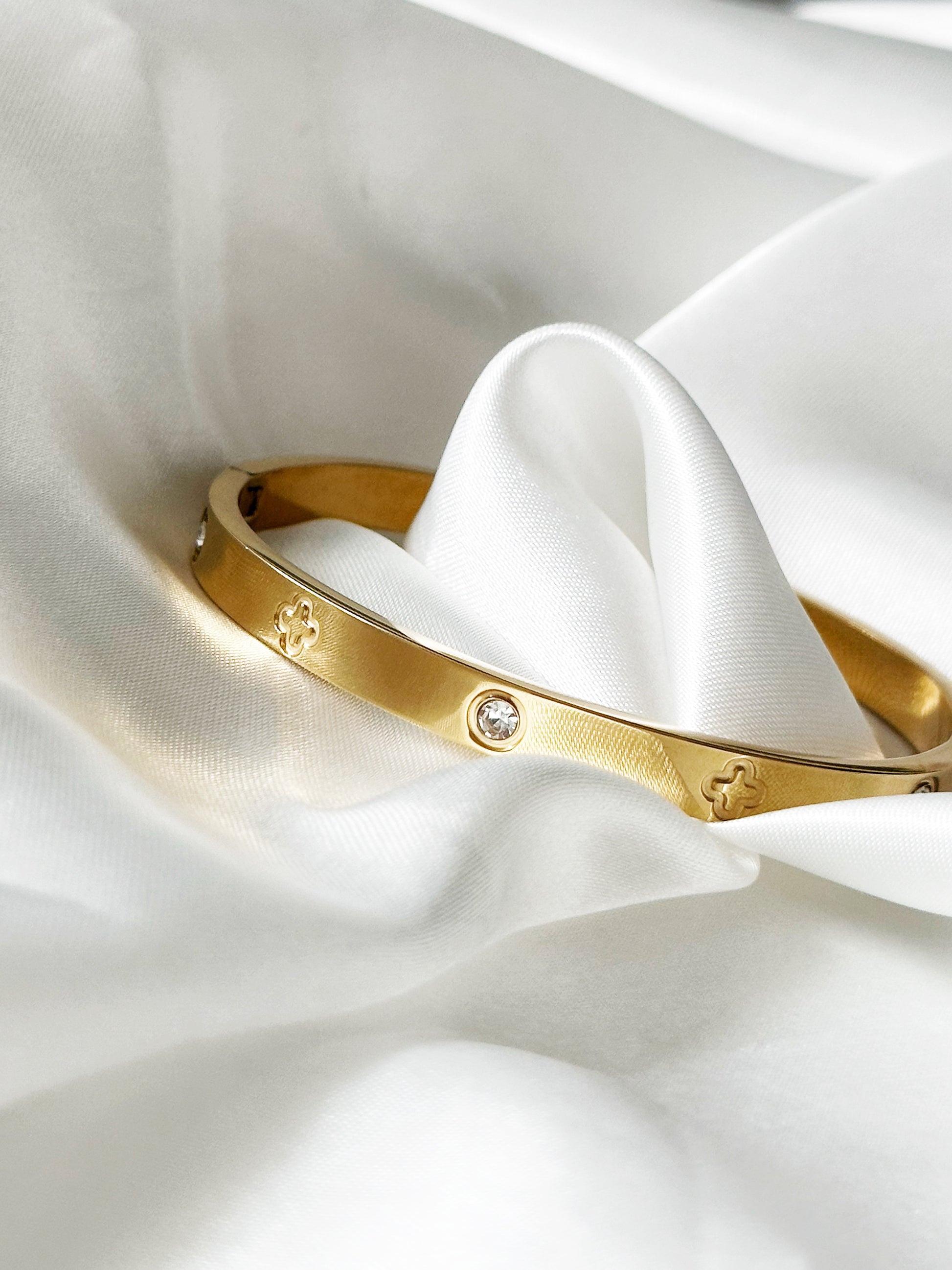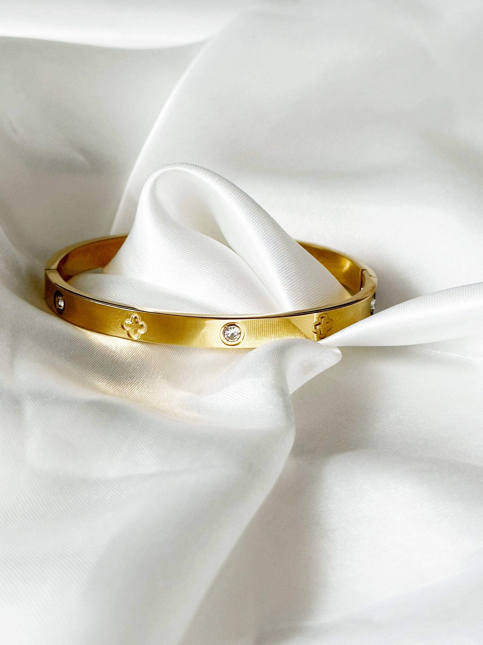 Der “Fortuna Glanz” Armreif vereint goldene Eleganz mit einem Hauch von Glück. Aus edelstem Edelstahl gefertigt und verziert mit glänzenden Steinen sowie feinen kleeblattförmigen Gravuren, symbolisiert dieses Schmuckstück Luxus und Wohlstand. Die Breite von 6 mm unterstreicht die stilvolle Präsenz des Armreifs und macht ihn zu einem idealen Accessoire für all jene, die ihrem Outfit ein bedeutungsvolles Highlight hinzufügen möchten.