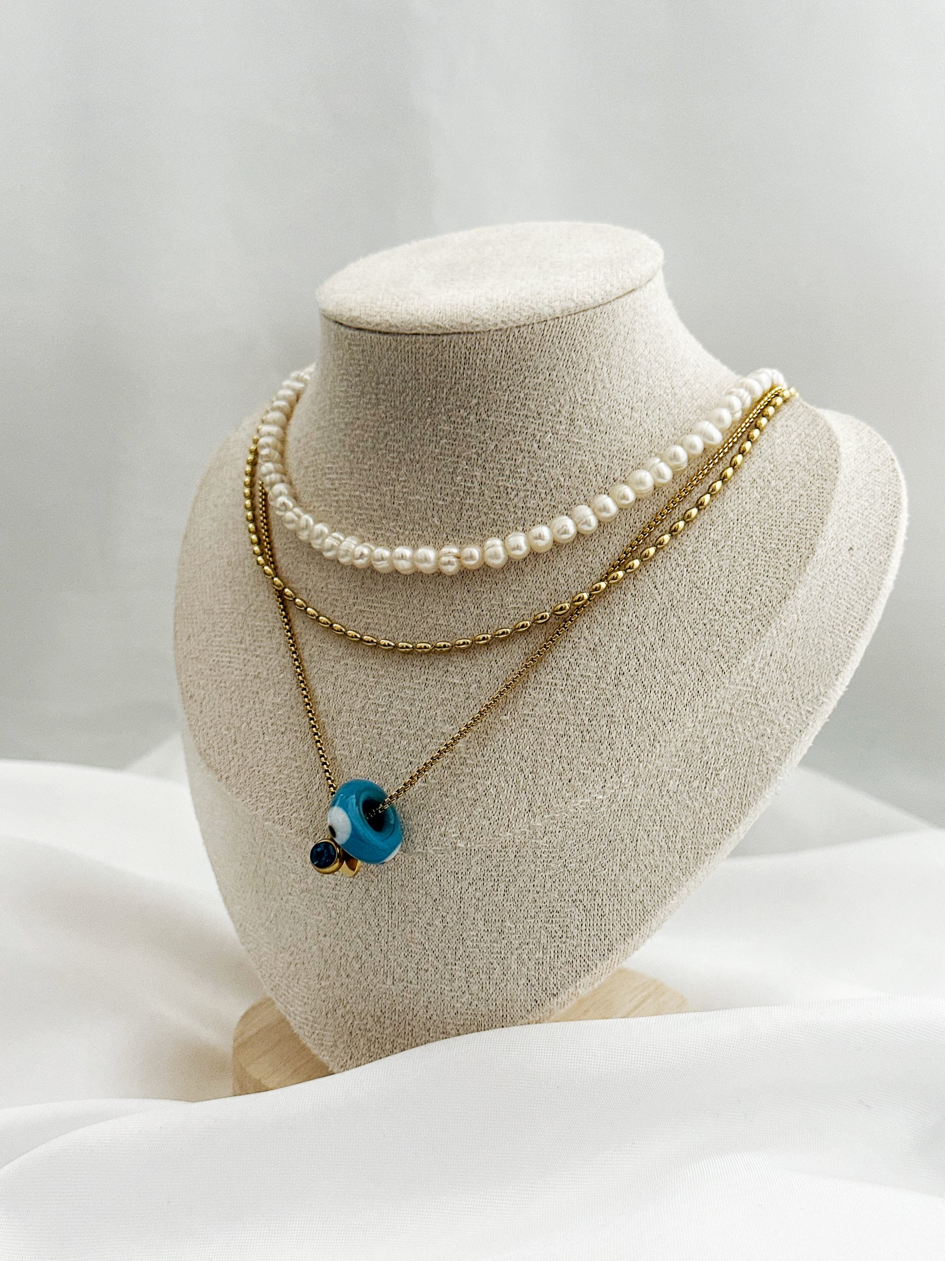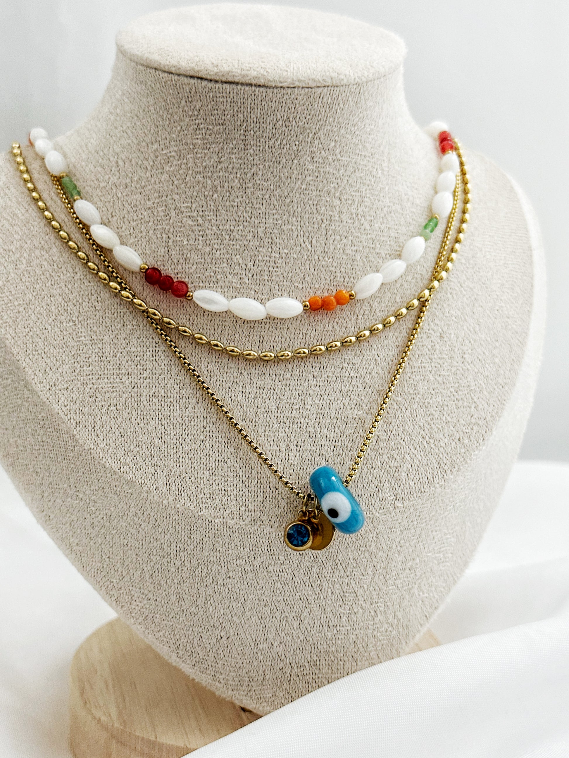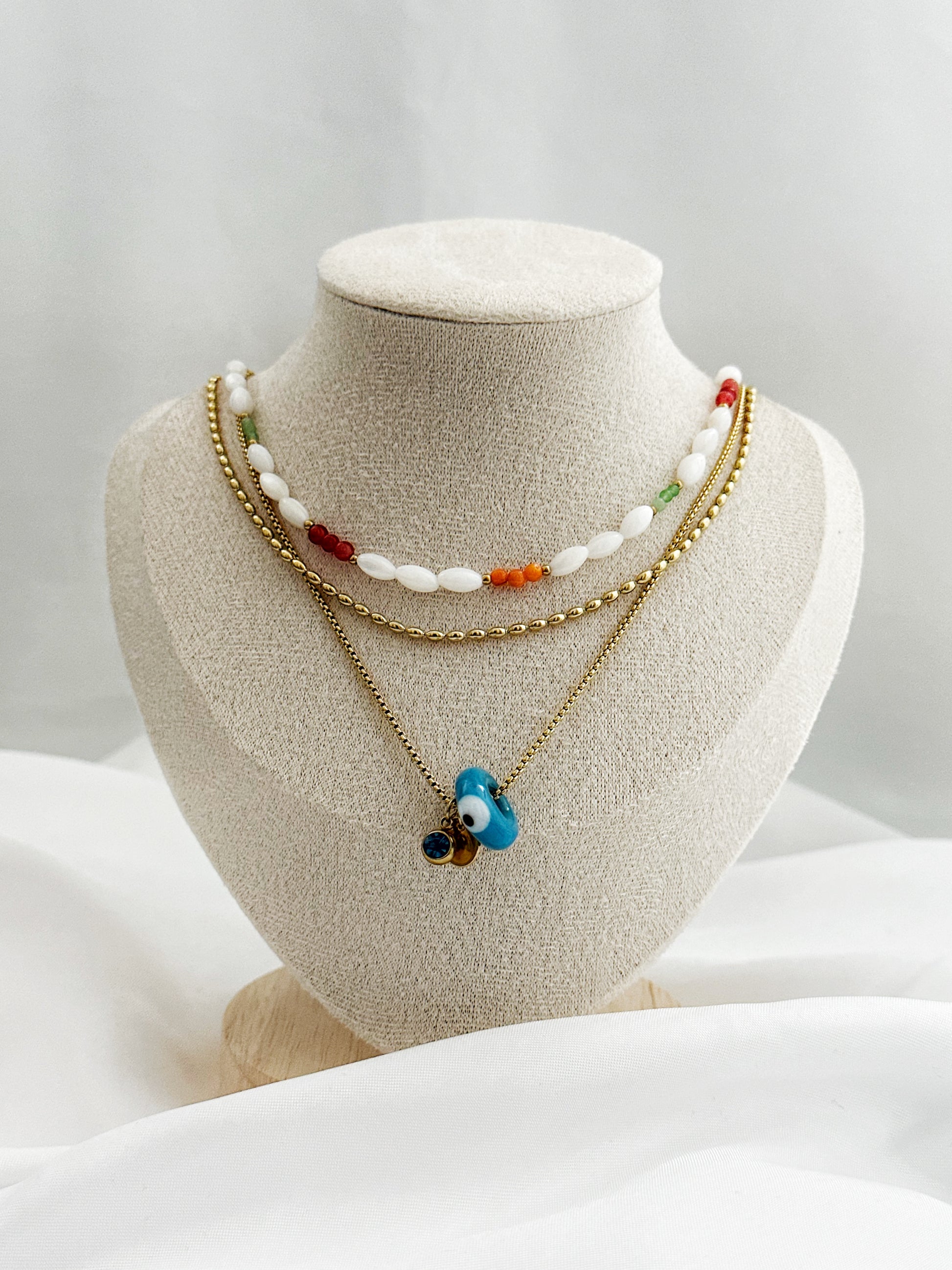 Dieses 3-teilige Schmuckset vereint modernen Layering-Look mit spirituellen Elementen und natürlichen Materialien. Zarte Perlen, Aventurin, Koralle, Nazar-Auge und vergoldete Details machen das Set zu einem einzigartigen Begleiter – ob im Alltag, im Urlaub oder zu besonderen Anlässen.