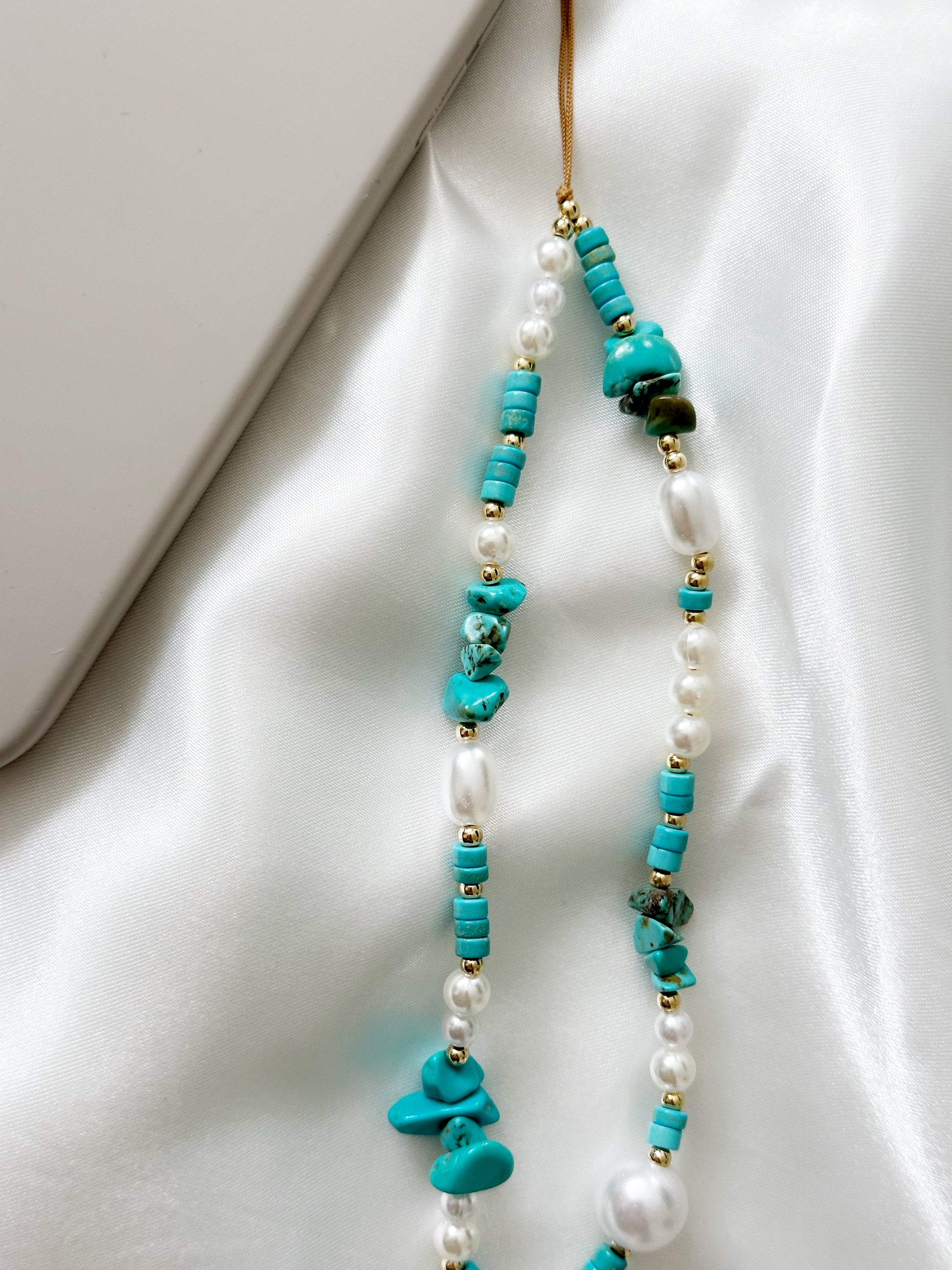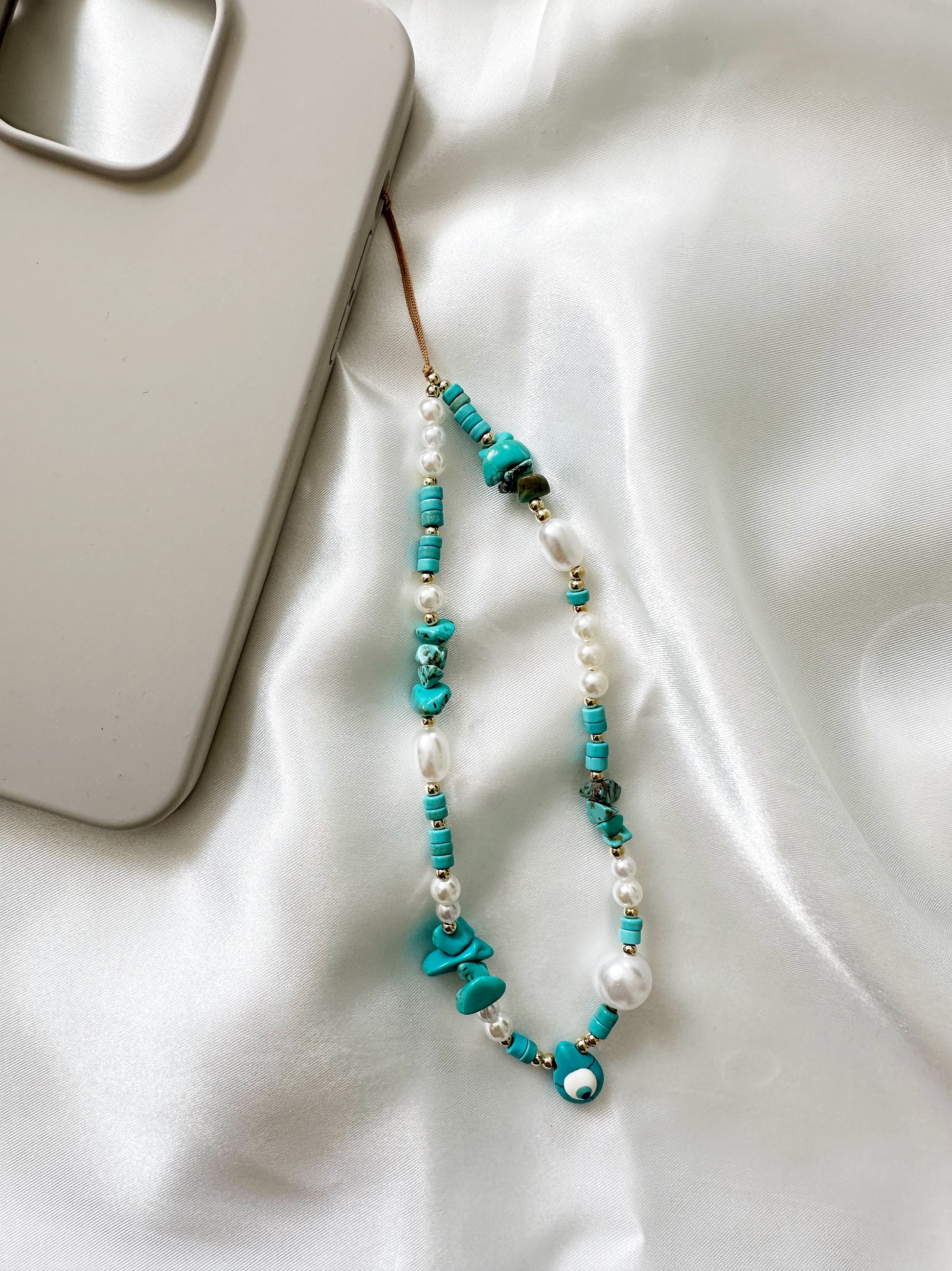 Türkis Handykette mit Nazar Auge – Splitterstein Kette mit weißen Perlen – Schutz & Stil