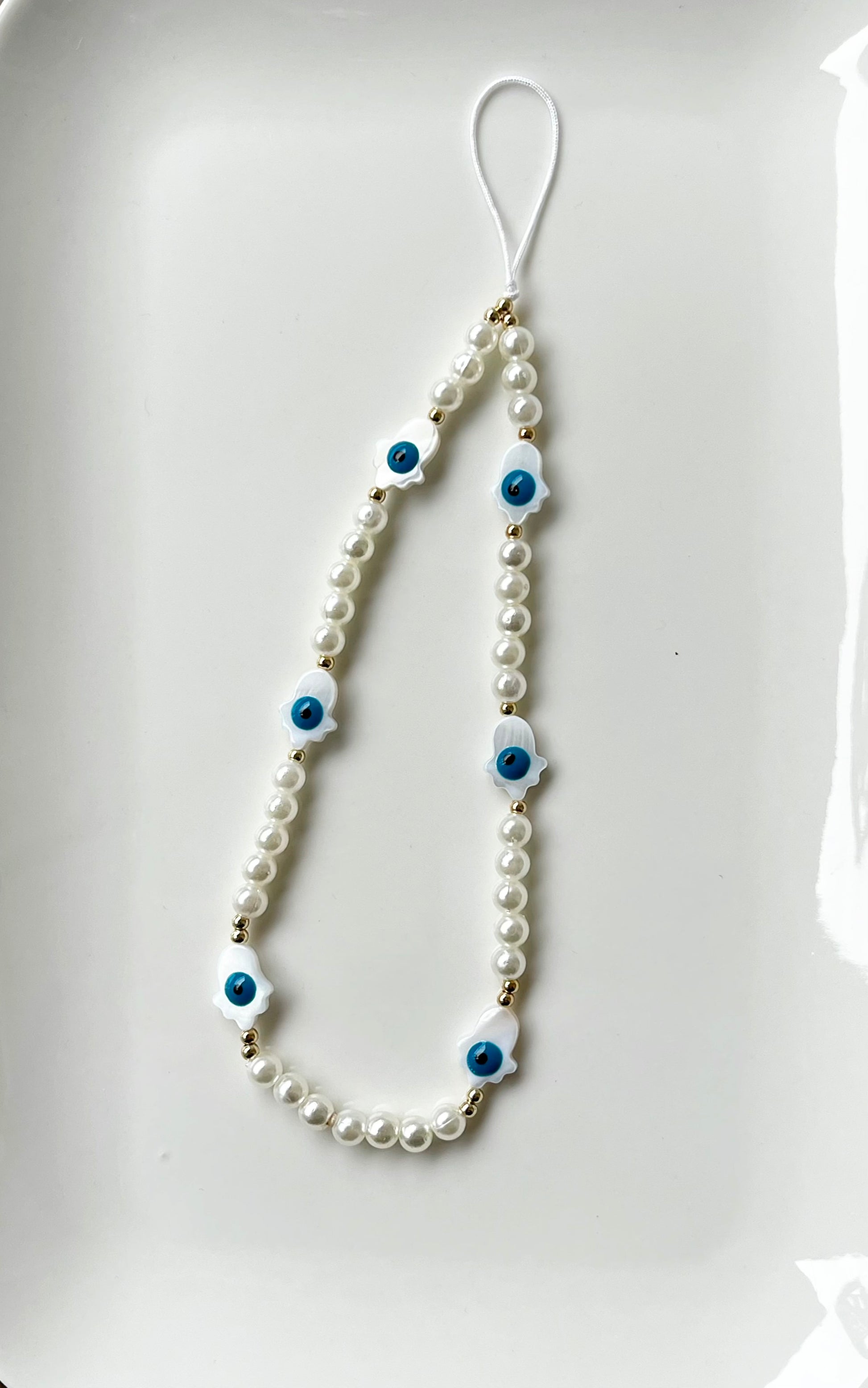 Perlen Handykette mit Nazar Auge – Weiß Gold Hamsa Style – Schutz Anhänger – Stylisches Handy Zubehör – Handmade Geschenkidee