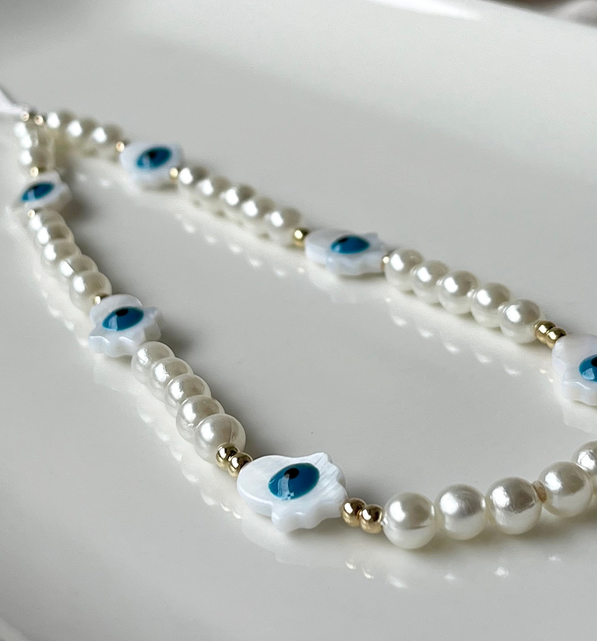 Die Kombination aus zarten Perlen und den blauen Nazar-Augen sorgt nicht nur für einen besonderen Look, sondern schützt dich auch symbolisch vor negativen Energien – ein idealer Begleiter im Alltag.